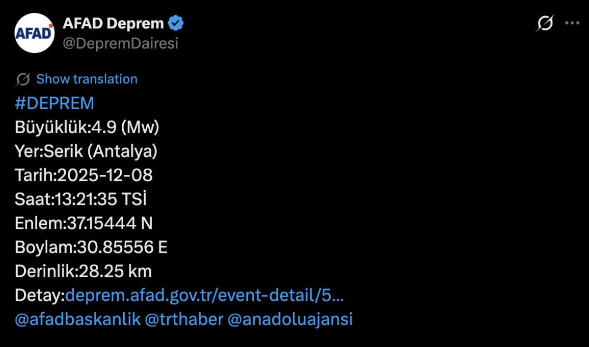 Kentte merkez üssü Serik olan 4.9 büyüklüğünde bir deprem meydana geldi.