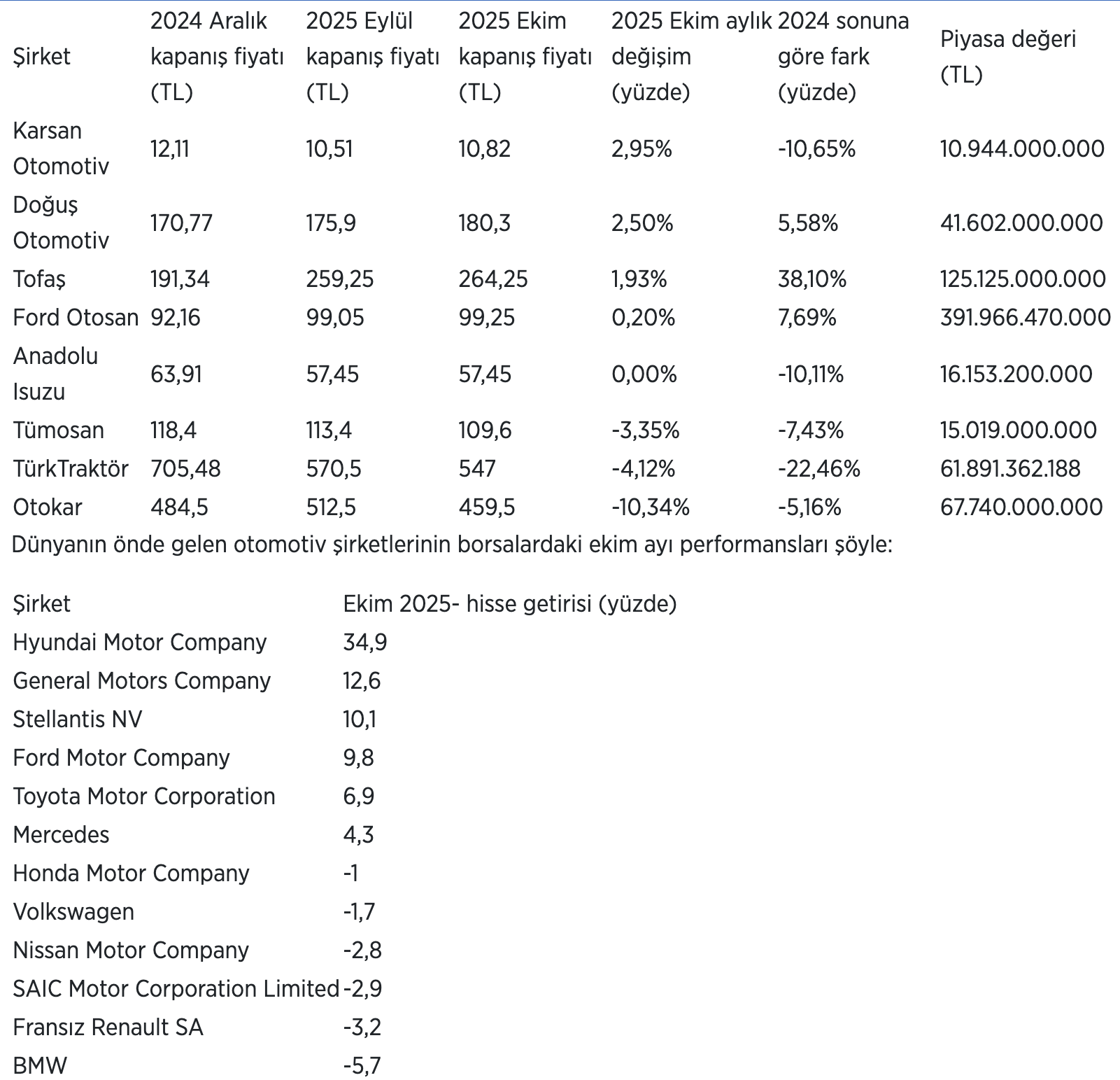 Borsada işlem gören 8 otomotiv şirketinin Aralık 2024, Eylül 2025 ve Ekim 2025 itibarıyla hisse kapanış fiyatı, değişimi ve şirketlerin piyasa değeri şöyle: