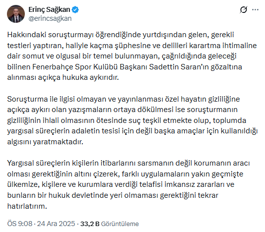 Türkiye Barolar Birliği (TBB) Başkanı Erinç Sağkan, Fenerbahçe SK Başkanı Sadettin Saran’ın gözaltına alınması hakkında açıklama yaptı.